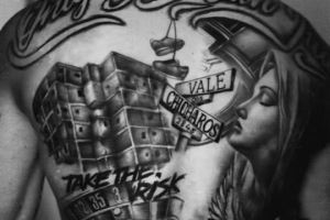 莱奥纹身的右侧是圣母玛利亚的头像,左侧是他从小生活的街区图,中间还有两块路标,上面写着莱奥家乡塞图巴尔区的邮编2845。纹身的左下方是一句口号“冒险”,旁边是轮盘赌和四张A扑克牌。