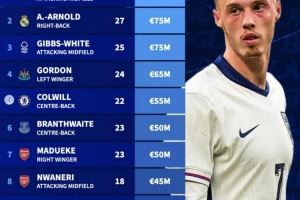 德转列缺席本期英格兰名单身价榜:帕尔默居首,阿诺德次席